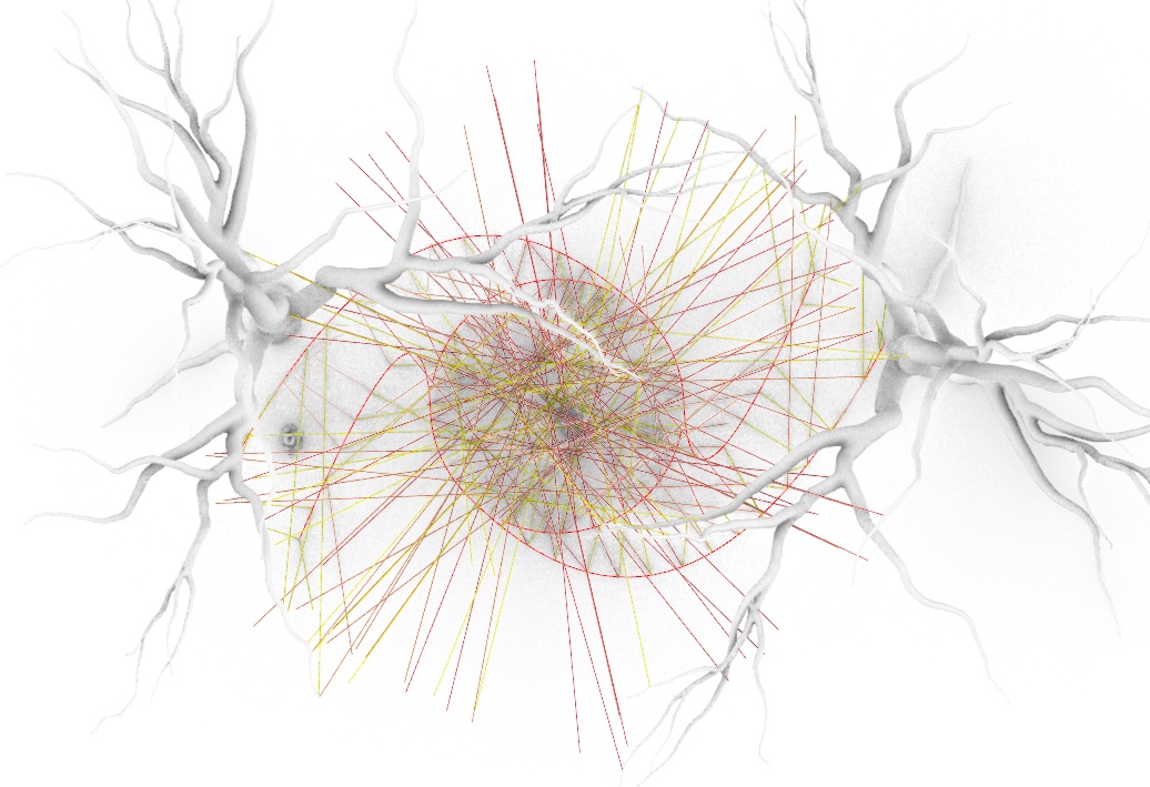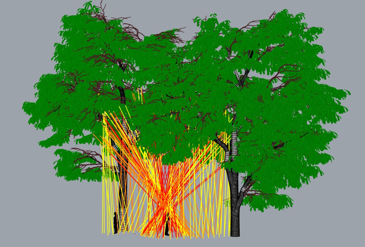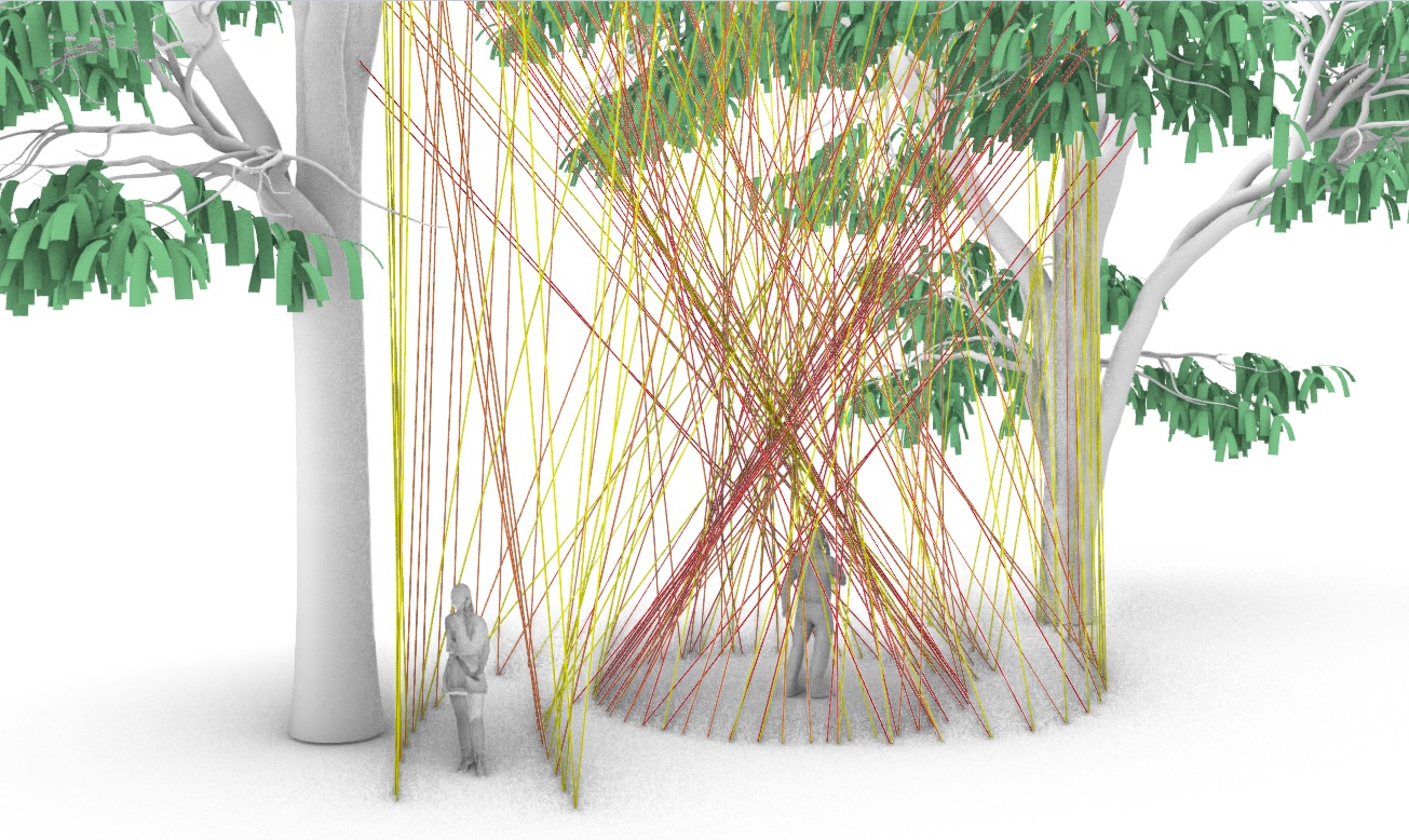 Bungee cords rise up from each ground anchor into the tree canopies. These coloured cords define the walls of a path/ tunnel. As you make your way inside, the space is compressed from a tall entrance to an intimate inner kernel. This might contain natural seating and a bungee divide to pass through to an exit tunnel.