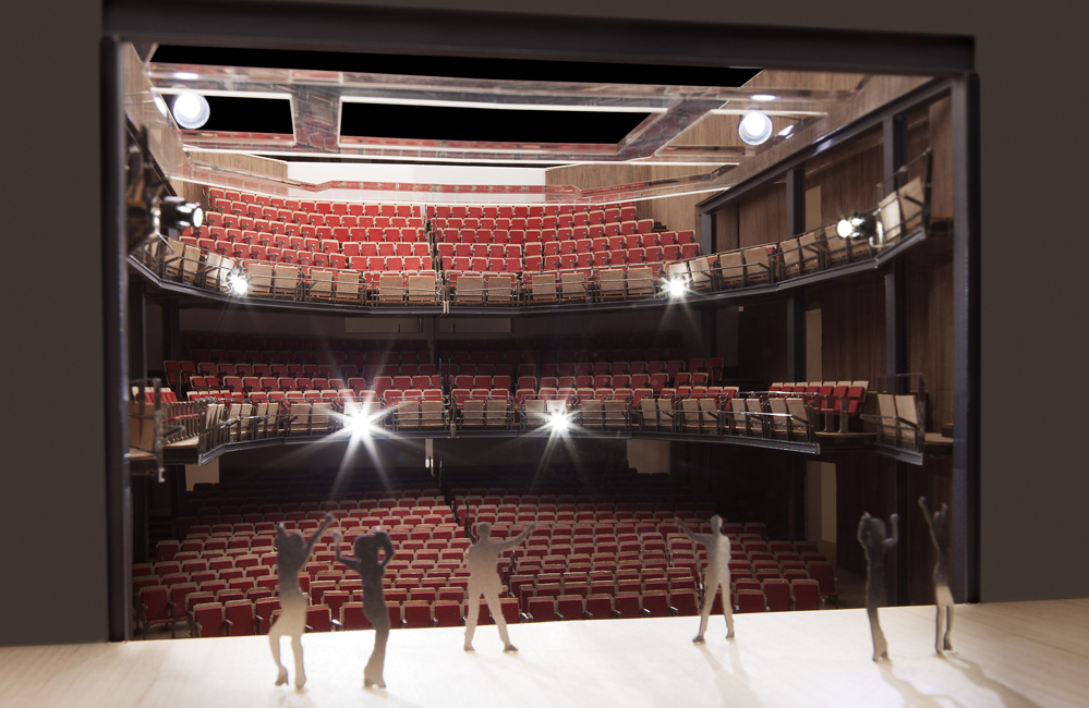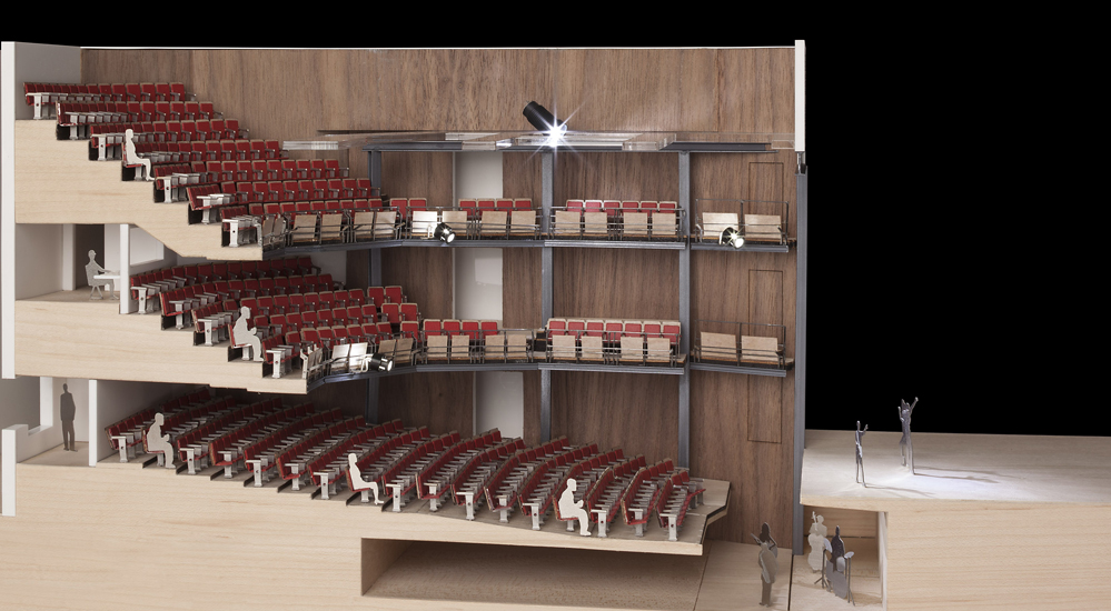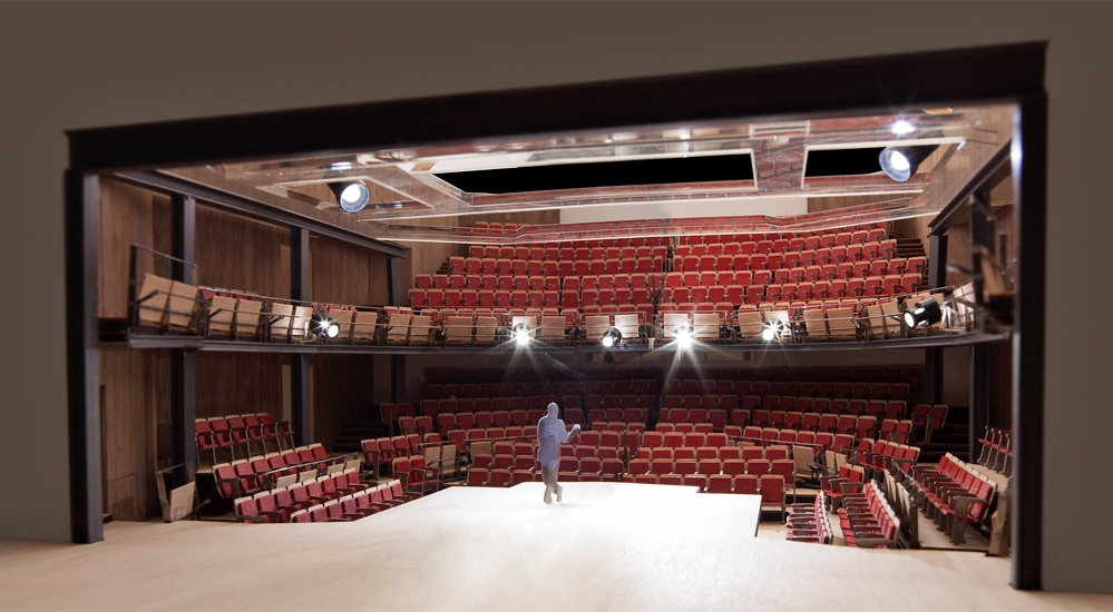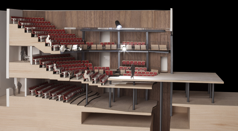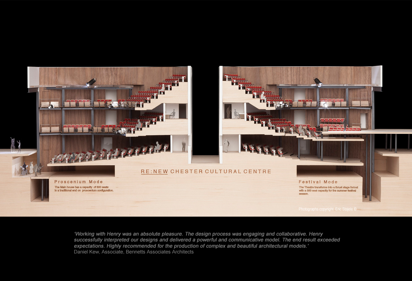Chester Theatre is undergoing a major enlargement programme. Henry Milner was comissioned to build a detailed model of the new main theatre space. This space is designed to transform from an 800 capacity end on theatre to a smaller capacity with a more intimate stage for the summer show season. The model shows both modes in section for the benefit of those building the theatre and the public. It was designed to accommodate a mirror so each entire space could be captured photographically.