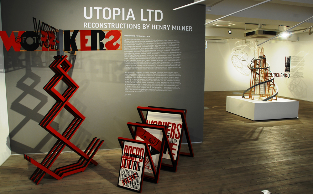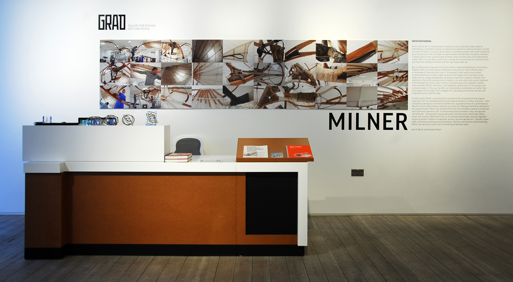 The Gallery for Russian Art and Design in Knightsbridge in London approached Henry Milner to compile a show of his constructions. The show brought together both his reconstructions of lost pieces of constructivist art and his interpretations of artists renderings. The artist covered were El Lissitzky, Gustav Klucis, Alexandre Rodchenko and Vladimir Tatlin. The constructions give the viewers a magical and haptic insight into Pieces that have never been realised or are long lost.